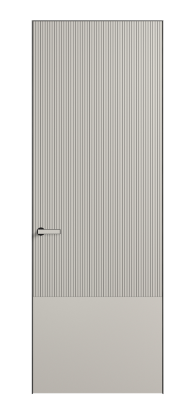 Это полотна с рельефной фрезеровкой. Этот прием делает интерьер объемным, тактильным, вносит интересную текстуру и создает современный образ. Волнистый рельеф может быть выполнен по ламелям из массива дуба в древесных матовых отделках, либо исполнен по натуральному и экологически безопасному материалу — ХДФ, покрытому гладкой эмалью актуальных оттенков.